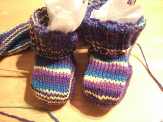 The cutest booties, and a matching hat-to-come. So cute and so quick, and I will do it all over again for the March baby. I've used stash yarn - I think it is ancient Knitpicks sock yarn that I've had forever. It's purple, blue and yellow, and since the gender of both is unknown (cough-I think both boys-cough) I figured this would work with either gender.